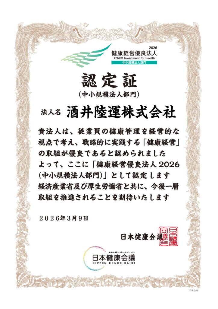 酒井陸運株式会社は、多様な人材が活き活きと活躍できる人材基盤を将来にわたって維持していくため、令和7年度に「健康宣言」を策定するとともに、